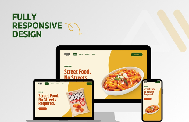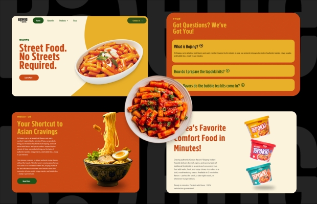 A vibrant, modern landing page designed for Bojang, an Asian street food brand. The website highlights bold typography, warm color palettes, and dynamic food imagery to create an appetizing and energetic user experience. It showcases key sections including product offerings, brand values, testimonials, and FAQs, all structured for easy navigation and engagement. The design focuses on visual storytelling and clear calls-to-action, making it both aesthetically appealing and conversion-friendly.